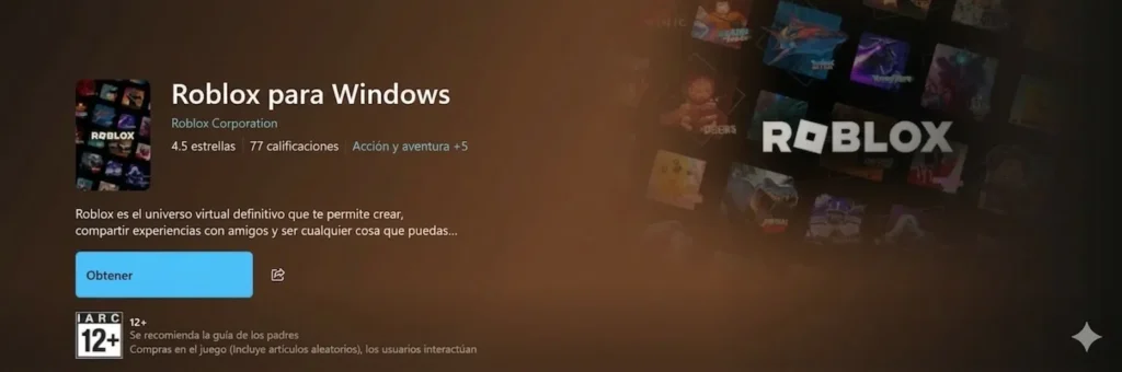 Ve a roblox.com, inicia sesión o crea una cuenta, entra a cualquier juego y presiona el botón Jugar. Se descarga automáticamente el instalador. Ejecútalo y Roblox queda instalado en menos de 3 minutos. También puedes descargarlo desde Microsoft Store si tu red bloquea archivos .exe.