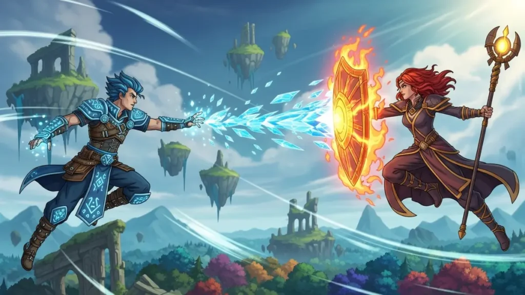 Lo que lo hace especial es el sistema de combos. Cuando combinas habilidades — por ejemplo, lanzas una bola de fuego dentro de una nube tóxica — creas explosiones elementales masivas que pueden acabar con escuadras enteras. El estilo artístico cartoon se siente muy cercano al de Fortnite, lo que lo hace cómodo inmediatamente para cualquiera que venga del juego de Epic.